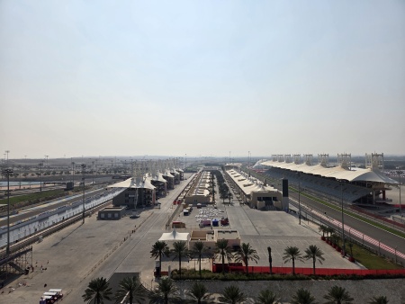 Nejzajímavější zastávkou dopoledne byl ale Bahrajnský závodní okruh, kde se jezdí Velkou cenu Bahrajnu. Do poslední chvíle jsme nevěděli, co všechno bude přístupné, protože místní agentura pouští návštěvníky na různá místa podle toho, co se kde zrovna koná, kde se co jezdí nebo naopak rekonstruuje. Měli jsme velké štěstí a pustili nás na vyhlídkovou věž, kde jsou VIP klubová patra, do mediálního centra, do řídícího centra, samozřejmě na tribuny, ale taky i přímo na dráhu v cílové rovince. Závodila tam zrovna jedna ještěrka (jako to auto).