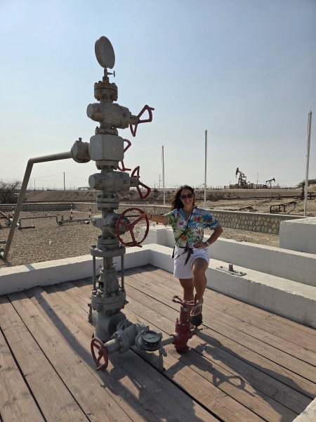 A další zastávkou byl první bahrajský ropný vrt. Prý třetí nejstarší vrt na světě vůbec. Protože muzeum je od covidu zavřené, byla to zastávka na 10 minut. Zajímavější bylo jen tak projíždět kolem všech ropných pump v poušti.