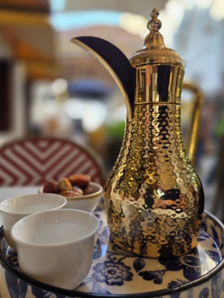 Druhou zastávku ve městě byl typický lokální bazar Manama Souq. Protože jsme já i Vláďa na pár takových trzích už byli, tak jsme se rozhodli rozchod skupiny strávit v kavárně. A tady jsme udělali chybu - dali jsme na doporučení průvodce a objednali si pravou arabskou kávu. Ta je světlejší, protože se zrna praží při nízkých teplotách a přidává se do ní šafrán, takže vůbec nechutná jako káva, na kterou jsme zvyklí. Vláďa tvrdil, že chutná jako vyprané ponožky, já zase, že jako hodně divný čaj.
